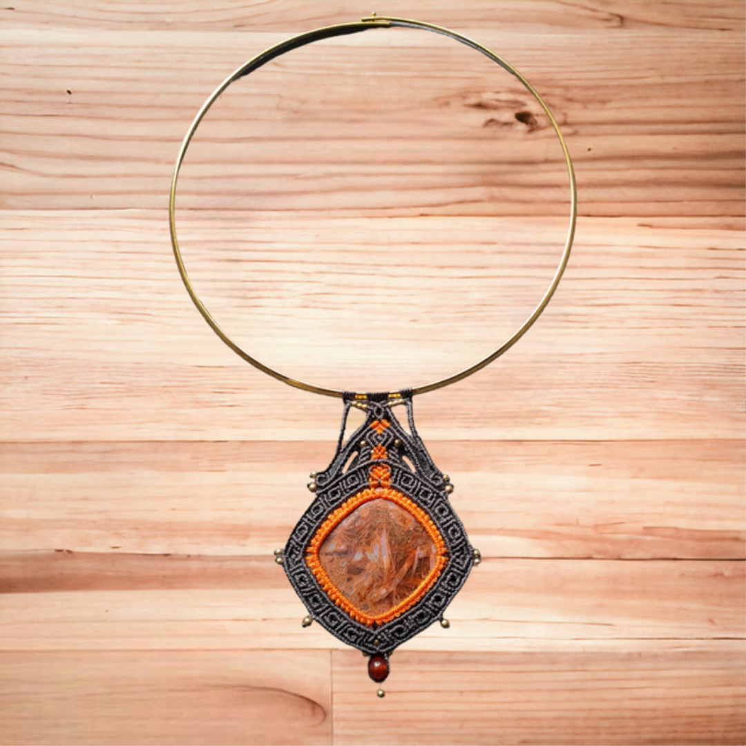 Collier en micro-macramé fait main, inspiré de l’esthétique aztèque, avec une agate turkey.