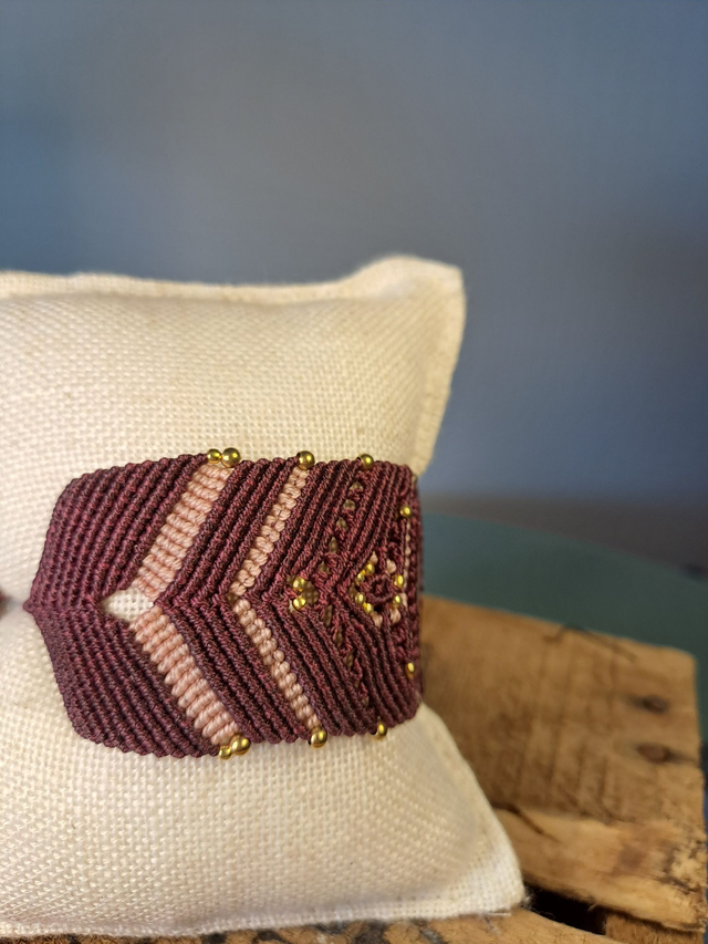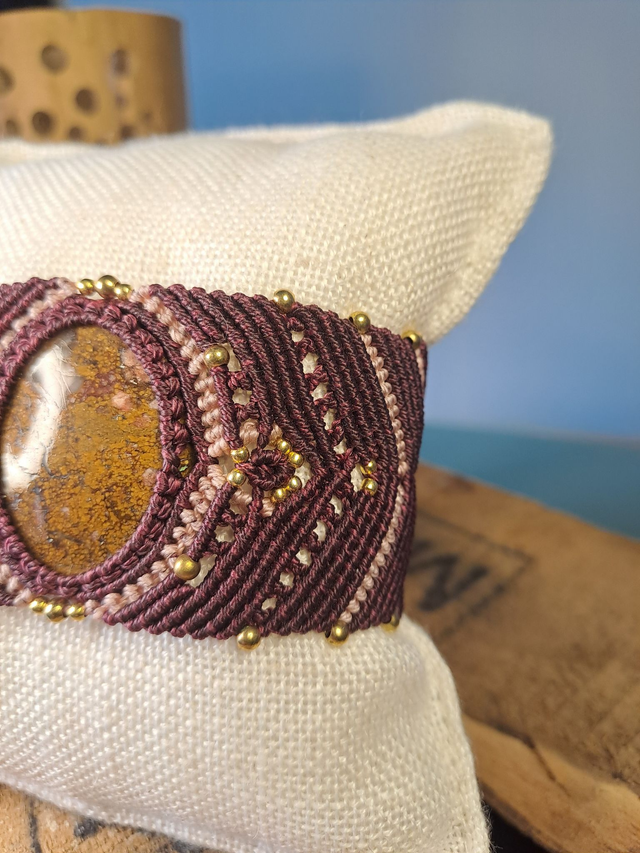 Bracelet en micro-macramé réalisé à la main, orné d’une pietersite aux nuances rosées et profondes.