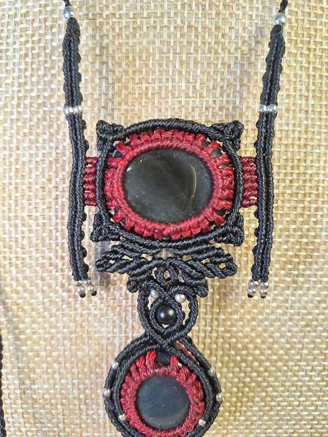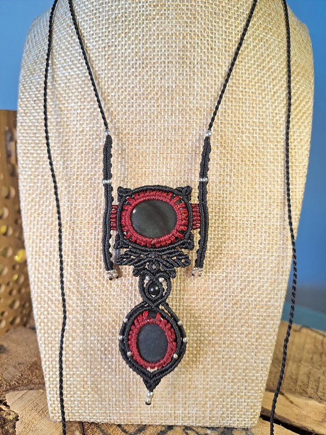Collier en micro-macramé fait main, mêlant obsidiennes argentées et délicats motifs de feuilles..